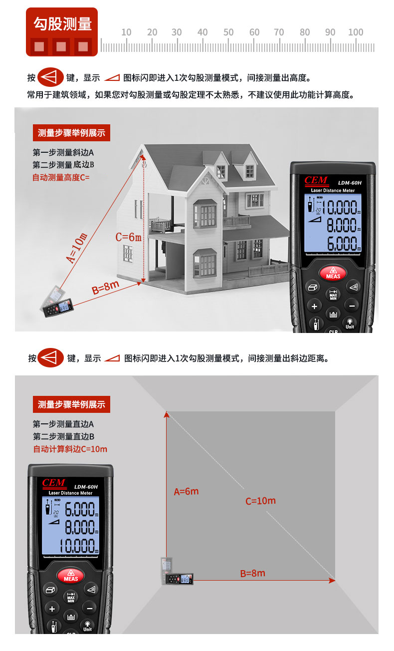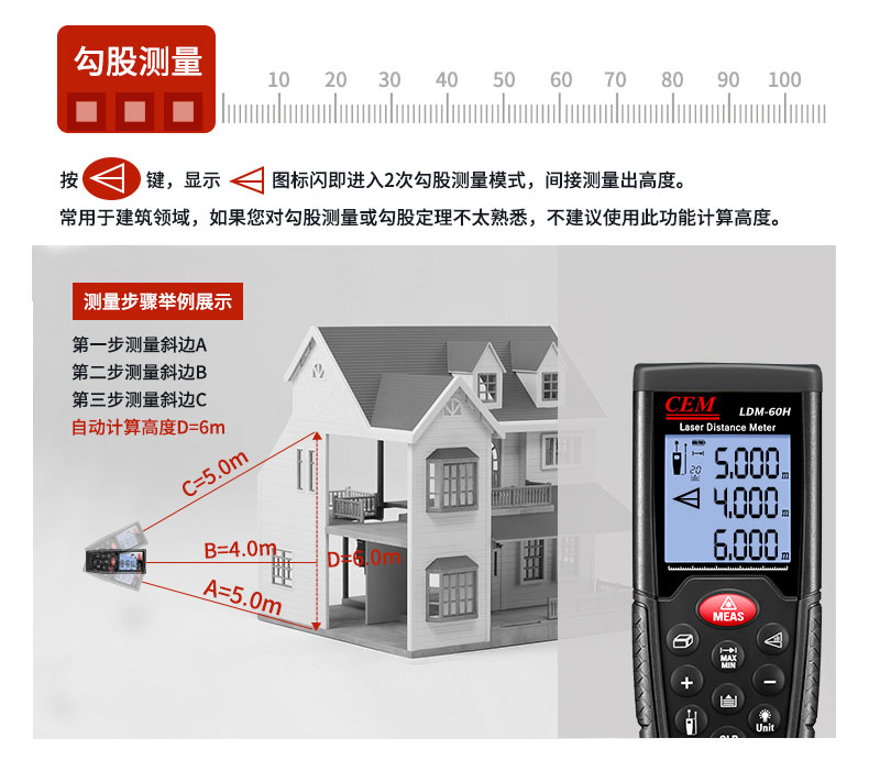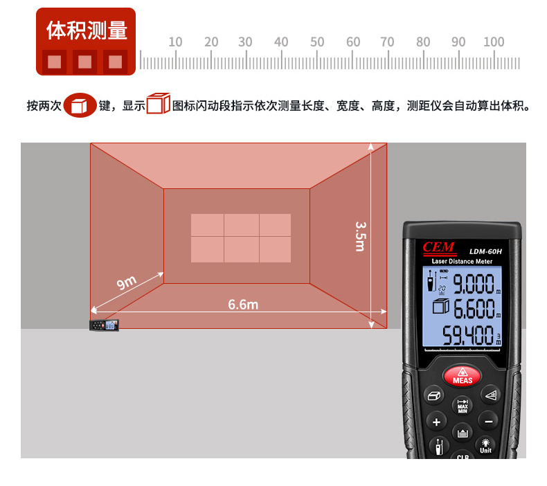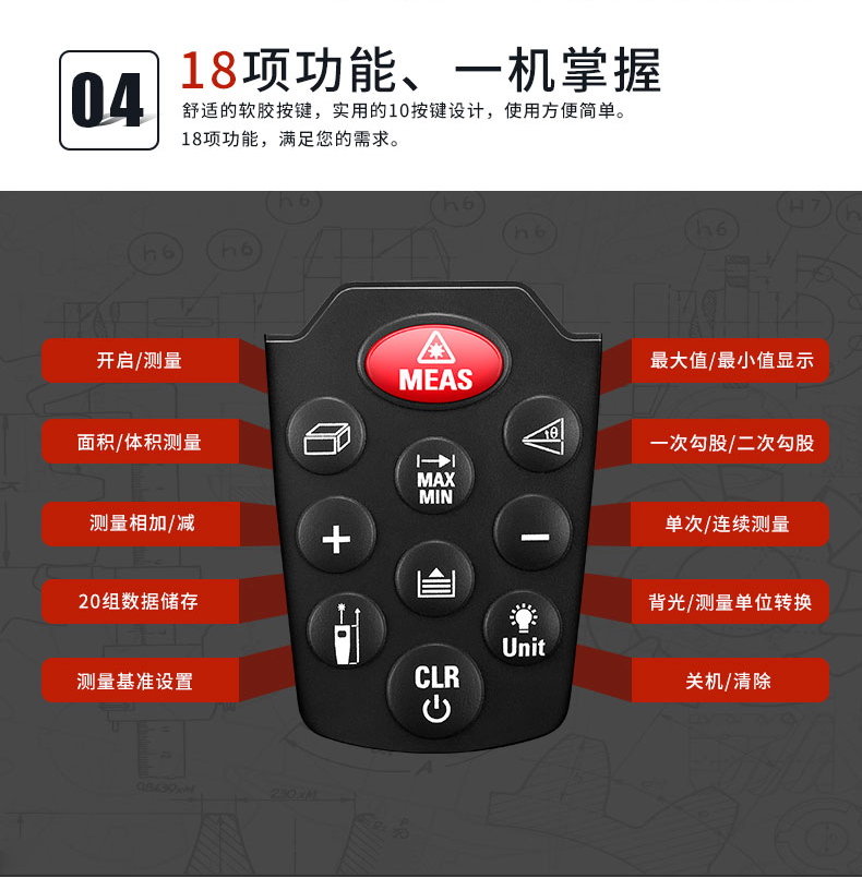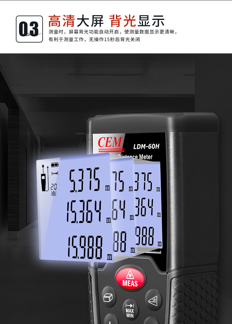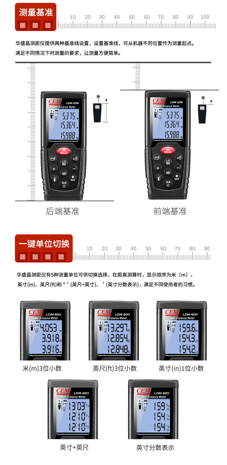 CEM自行設計、研發和制造的LDM-100手持式激光測距儀系列,使用簡單安全,僅需單人操作并無需借助其他工具,即使在非常苛刻的測量環境中也可輕松應對。精巧便攜的外觀設計便于室內和戶外使用,加、減、勾股定理、面積和體積計算的快捷鍵使得測量迅速而可靠,至少可存儲20組數據。此系列產品僅是CEM在激光測距領域的技術創新和變革開始,后續CEM將為用戶提供更新、更及時的產品和服務。