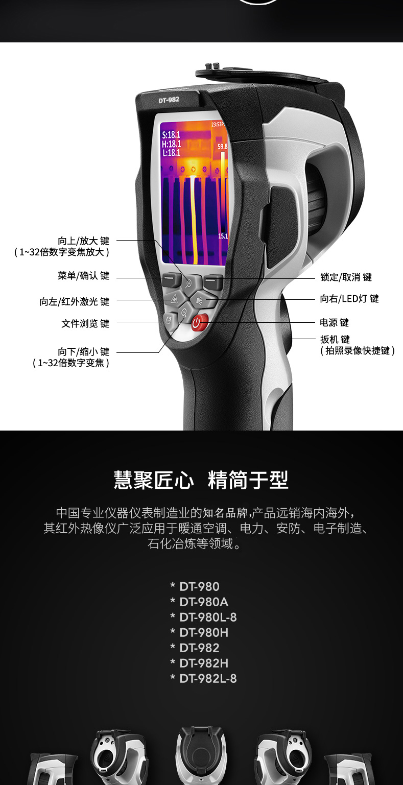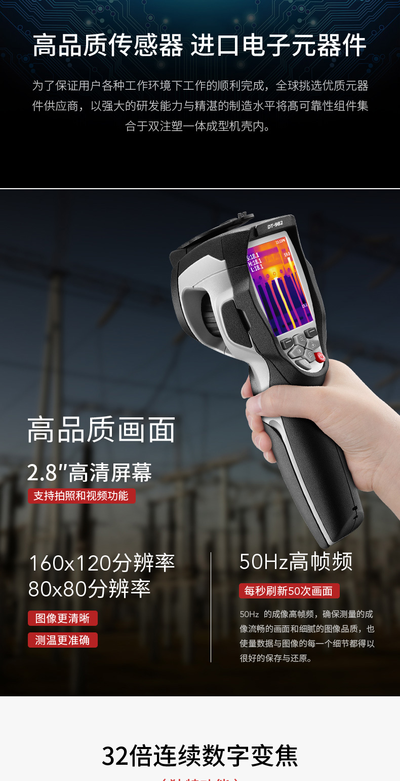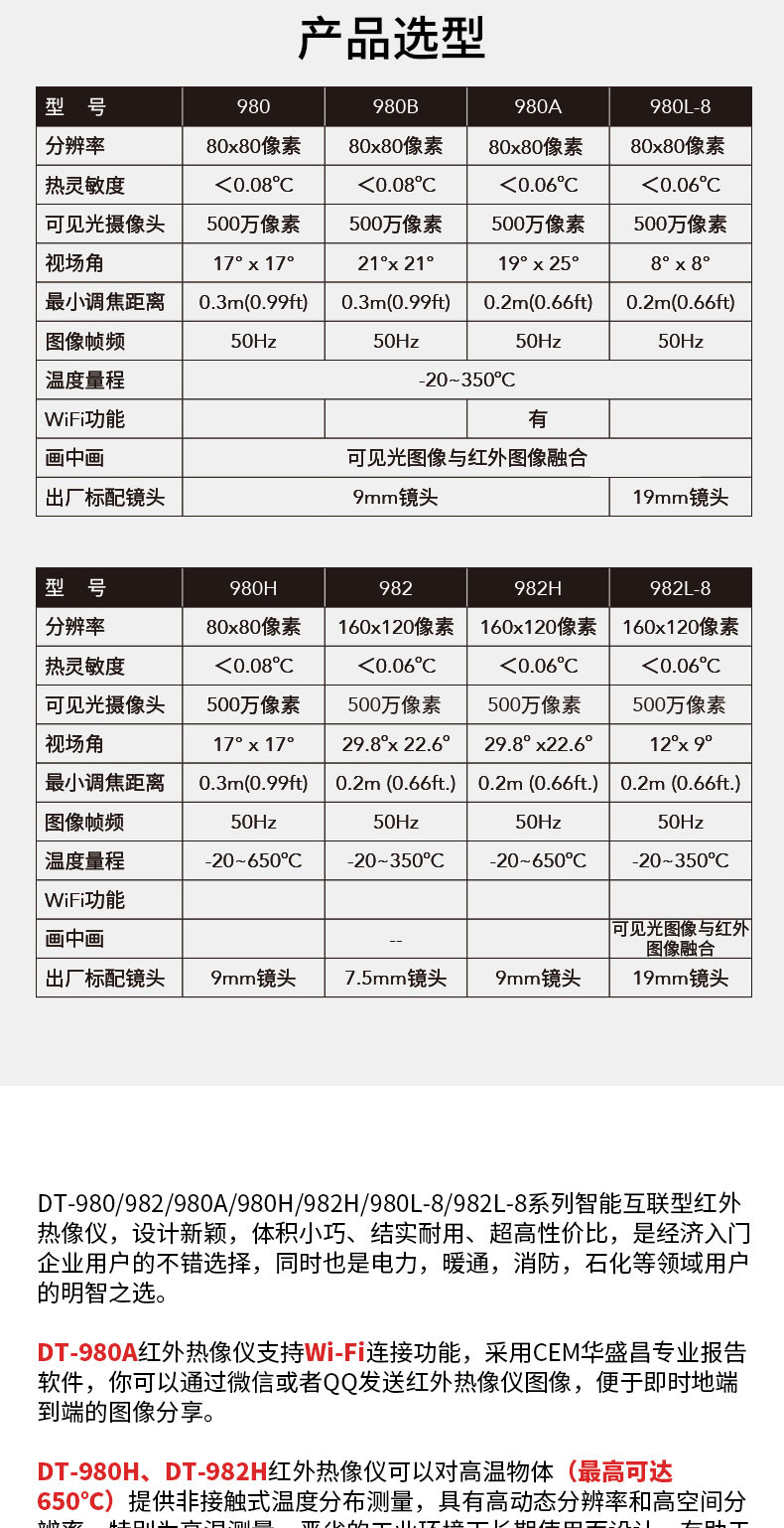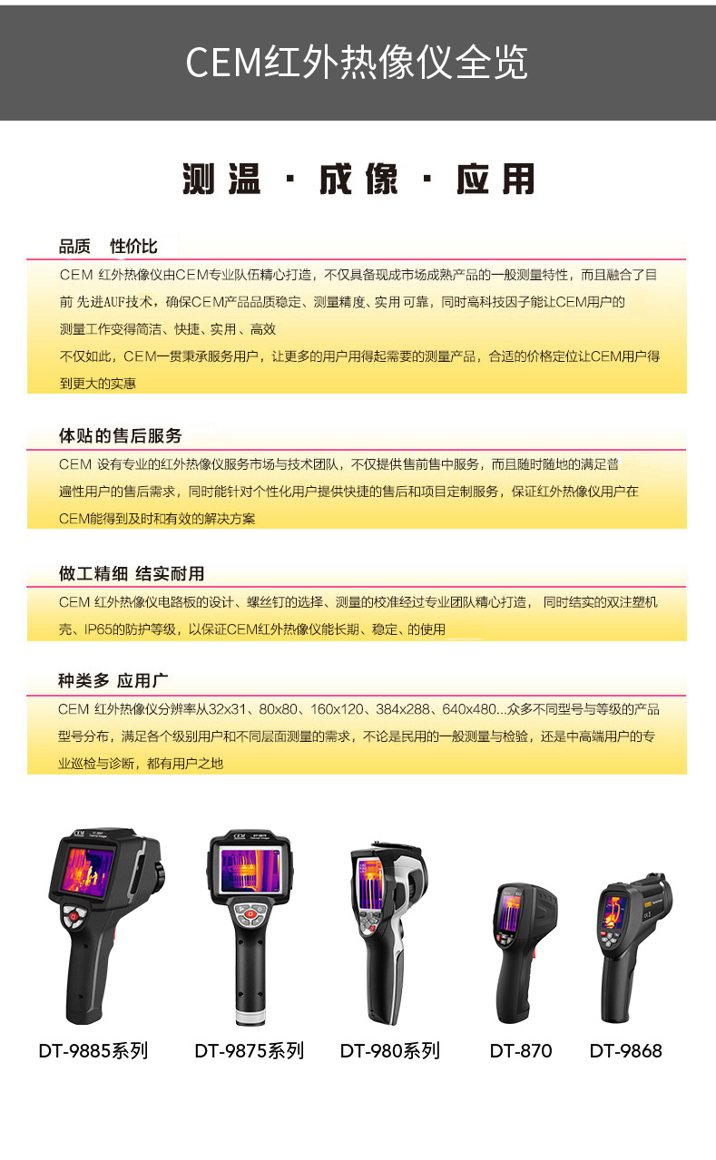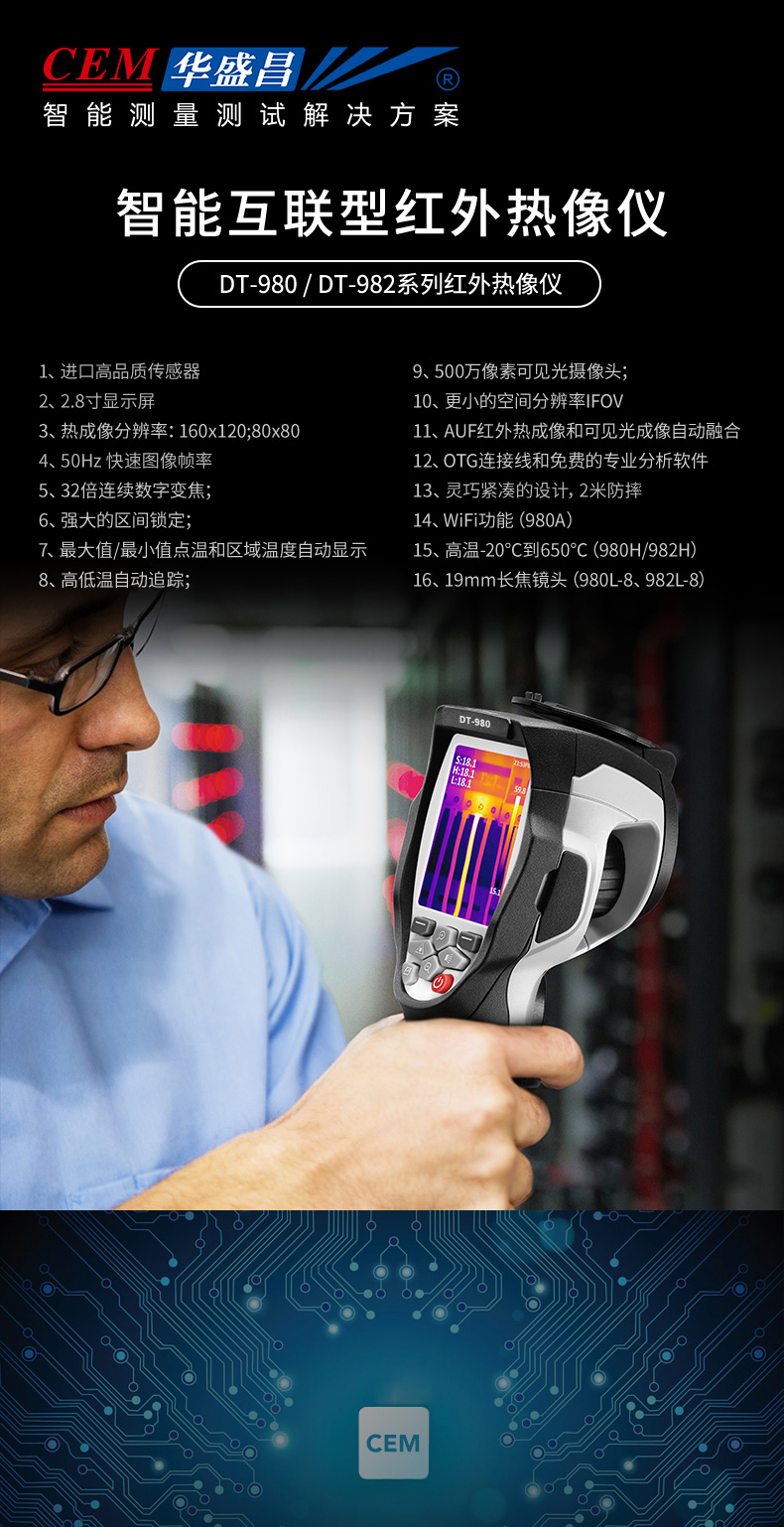 CEM華盛昌熱成像測(cè)溫儀dt980系列專業(yè)工具型紅外熱像儀, 包含80*80、160*120像素分辨率,體積小巧、 結(jié)實(shí)耐用、性價(jià)比高,32倍數(shù)字變焦、50Hz圖像幀頻以及不同的型號(hào)的參數(shù)設(shè)置,能更好的滿足電力、環(huán)保、HVAC、能源以及其他日常工程建設(shè)和設(shè)備維護(hù)的需求。