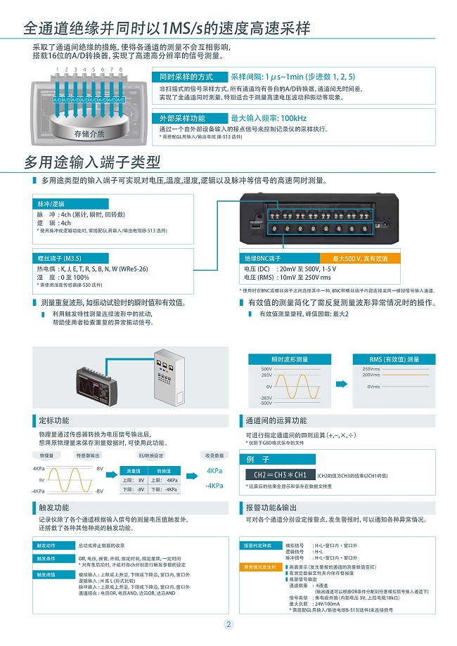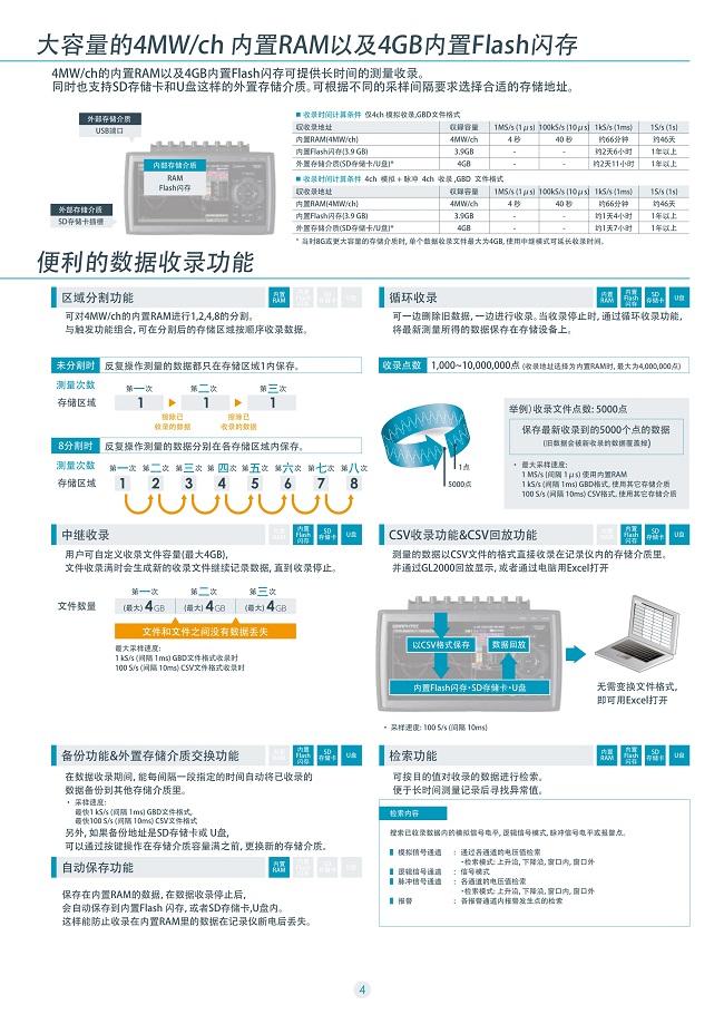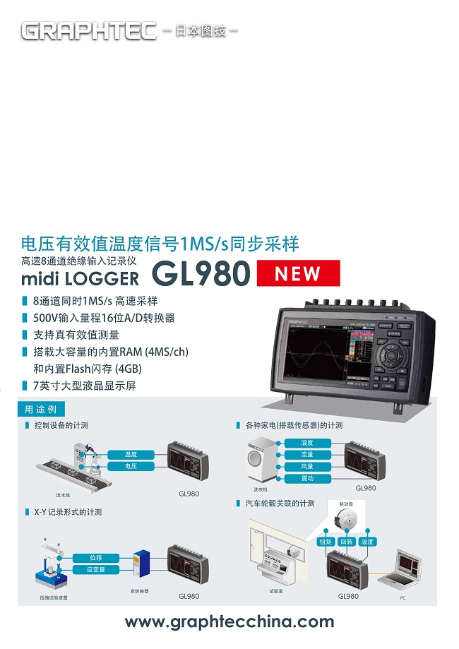 日本圖技八通道數據采集器GL-980 簡介: 日本圖技八通道數據采集器GL-980原GL900-8記錄儀的升級產品,8通道絕緣輸入記錄新型號GL980可實現高速 1MS/s 的同步采樣,可以高效測量電壓、電流、溫度、壓力、流量和邏輯信號。GL980有強大的存儲空間,機器內置4G內存,還可以外接SD卡,記錄時間長存一年以上。