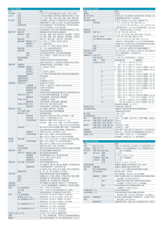 | 顯示畫面(LCD) | 尺寸 | 7英寸TFT彩色液晶顯示屏 (WVGA: 800×480) | | 信息 | Y-T波形顯示和測量值, 全屏波形畫面, 測量值+實時統計運算值, X-Y畫面 | | 語言 | 日語, 英語, 法語, 德語, 中文, 韓語, 俄語, 西班牙語 | | PC接口 | 類型 | 以太網端口 (10BASE-T?100BASE-TX), USB2.0端口(高速) | | 實時傳輸速度 | *快1ms | | 互聯網功能 | Web服務器功能, FTP服務器功能, NTP客戶端功能, DHCP客戶端功能, Email發送功能 | | USB功能 | USB驅動模式 (內置Flash閃存與外置SD存儲卡內文件的傳輸與刪除) | | 觸發功能 | 種類 | 啟動: 觸發條件成立時數據收錄開始 停止: 觸發條件成立時數據收錄停止 | | 條件 | 啟動 | O?, 電壓, 報警, 外部, 指定時刻, 指定星期, 一定時間 | | 停止 | O?, 電壓, 報警, 外部, 指定時刻, 指定星期, 一定時間 | | 觸發組合 | 電壓OR, 電壓AND, 邊沿OR, 邊沿AND | | 觸發閾值 | 模擬輸入 | H/上升沿, L/ 下降沿, 窗口內, 窗口外 | | 邏輯輸入 | H, L (模式比較) | | 脈沖輸入 | H/上升沿, L/ 下降沿, 窗口內, 窗口外 | | 重復功能 | Off?On | | 重復間隔 | 從啟動到啟動的間隔, 從停止到啟動的間隔 1秒~9999小時59分59秒 | | 觸發檢測精度 | ±0.5% F.S. | | 報警功能 | 報警閾值 | 模式輸入 | H, L, 窗口內, 窗口外 | | 邏輯輸入 | H?L | | 脈沖輸入 | H, L, 窗口內, 窗口外 | | 報警組合 | Level OR 固定 | | 報警檢測周期 | 同采樣速度 | | 報警信號保持 | Off?On | | 報警檢測精度 | ±0.5% F.S. | | 存儲裝置 | 內置存儲介質 | 內置RAM | 4MW/ch (分割數量: 4MW×1, 2MW×2, 1MW×4, 0.5MW×8) | | 內置Flash閃存 | 約4GB (收錄可能容量 3.9GB) | | 外置存儲介質 | SD存儲卡插槽 | 1個插槽, SDHC對應, *大支持到32GB (單個收錄文件容量**4GB) | | U盤插槽 | 1個插槽, 無限制 (單個收錄文件容量**4GB) | | 收錄功能 | OFF(通用模式) | 收錄從啟動到停止之間的測量數據 | | 循環收錄 | 保存最新的數據 存儲地址: 內置RAM, 內置Flash閃存, SD存儲卡, U盤 收錄點數: 1,000~10,000,000點 ※使用內置RAM時, 10~4,000,000點 *快采樣間隔: 使用內置RAM時*快1μs, 其它情況下*快1ms (CSV格式收錄時10ms) ※收錄時長: GBD文件格式須15秒以上, CSV文件格式須30秒以上。 | | 中繼收錄 | 當4GB的收錄文件滿時, 會生成新的收錄文件繼續記錄數據, 直到收錄停止 收錄地址: 內置Flash閃存, SD存儲卡, U盤 *快采樣間隔: 1ms (CSV格式收錄時10ms) | | 檢索功能 | 作用 | 在已收錄的數據中檢索目標點 | | 模擬輸入通道 | 通過各通道的電壓值檢索 | | 邏輯通道 | 全部邏輯通道的H和L模式比較的檢索 | | 脈沖通道 | 上升沿, 下降沿, 窗口內, 窗口外的檢索 | | 報警發生點 | 報警發生點的檢索 | | 數據備份功能 | 備份間隔 | Off,1,2,6,12,24小時, 指定時刻, 用戶自定義時刻 *快采樣間隔: 1ms (CSV格式收錄時10ms) | | 備份地址 | 內置Flash閃存, U盤, SD存儲卡 | | 交換功能 | 備份地址可通過按鍵操作來在SD存儲卡和U盤之間切換 | | 運算功能 | 統計運算 | 實時收錄時 | 統計運算種類: *大值, *小值, 峰峰值, 平均值同時表示 | | 數據回放時 | 統計運算種類(光標間): *大值, *小值, 峰峰值, 平均值, 有效值同時表示 | | 通道間運算 | 加法, 減法, 乘法, 除法 (文件格式: 僅GBD) | | 定標功能 | 電壓?有效值 | 各通道輸入值(上下限值)?保存值(上下限值)的設定 | | 溫度 | 各通道輸入值, 保存值的設定 (偏置功能) | | 脈沖 | 各通道輸入值, 保存值的設定 (增益功能) | | 注釋功能 | 功能 | 各通道均可注釋名稱 | | 輸入字符 | 英語, 數字, 假名, 符號/td> | | 字符數量 | 31個字符(畫面表示最多8個字符) | | 使用環境 | 0 ~ 40℃ (AC電源適配器或電池使用時), 5~85%RH | | 電源 | AC電源適配器 | AC100 ~ 240V/50 ~ 60Hz | | DC電源 | DC8.5~24V (選件: B-514型DC驅動電纜) | | 電池 (*1) (*1) | 搭載2個專用鋰電池 (選件: B-569型專用鋰電池) | | 功耗 | AC 電源適配器使用時 (AC100V時) | LCD ON時: 約34VA(同時給電池充電時: 約47VA) 屏保啟動時: 約30VA(同時給電池充電時: 約44VA) | | DC電源使用時 | 電源: +24V時 | LCD ON時: 約0.6A(同時給電池充電時: 約0.9A) 屏保啟動時: 約0.53A(同時給電池充電時: 約0.82A) | | 電源: +12V時 | LCD ON時: 約1.22A(無法用于給電池充電) 屏保啟動時: 約1.07A(無法用于給電池充電) | | 電源: +8.5V時 | LCD ON時: 約1.81A(無法用于給電池充電) 屏保啟動時: 約1.55A(無法用于給電池充電) | | 外觀尺寸 [W × H × D] | 約 250 × 161 × 80mm | | 質量 | 約 1.4kg (不包括AC電源適配器和電池) | | 耐振性 | 相當于自動車部品**種A種 |