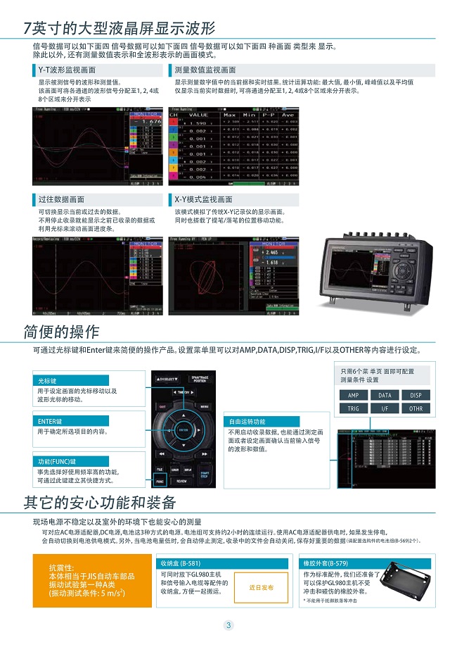 日本圖技八通道數據采集器GL-980特點 圖技數據記錄儀GL980可隨意使用的縱置型絕緣高速多功能記錄儀 可高速、同步測定長時間動作耐久試驗中的電壓、溫度等各類現象的數據記錄儀。 可進行絕緣多功能輸入,是可隨意使用的縱置型產品。 圖技數據記錄儀GL980支持高電壓測定 電壓范圍搭載寬幅DC500V范圍,還可進行AC100~350V電源電壓的波形測定。 同時,通過并用邏輯輸入或鉗位表,還可同步測定機器的電源電壓?電流、及各部分的程序控制信號。 可向物理量單位變換 測量電流或通過電壓測量各種物理現象時,可通過縮放功能變換為測定對象物的物理量。 普通物理量單位已事先登錄于主機內。 設定簡單,只需選擇設定種類,即可選擇與其相關的單位,十分簡便。此外,未登錄單位可以組合字母與數字進行創建。 高速同步取樣 搭載16位A/D 數據収錄可以*高100kHz的高速取樣速度,實現全頻道同步收錄。 同時,作為可進行高速取樣収錄的測量儀,還搭載16位A/D,實現高分解性能。 此外,還搭載有與外部機器同步取樣的外部取樣功能。 搭載大型5.7英寸彩色液晶顯示器 實行明亮、易識別的波形顯示 搭載明亮、易識別的大型5.7英寸彩色TFT液晶顯示器,實現鮮明、易識別的波形顯示。 用光標鍵進行簡單操作也可實現快速設定。借助示波器式樣的操作性,可對高速波形進行擴大/縮小的切換。 無需收錄數據便可確認的自由運行顯示 即便不開始測定,也可通過自由運行顯示確認輸入信號波形。只需接通主機電源便可在畫面顯示輸入信號波形,易進行范圍等的設定。