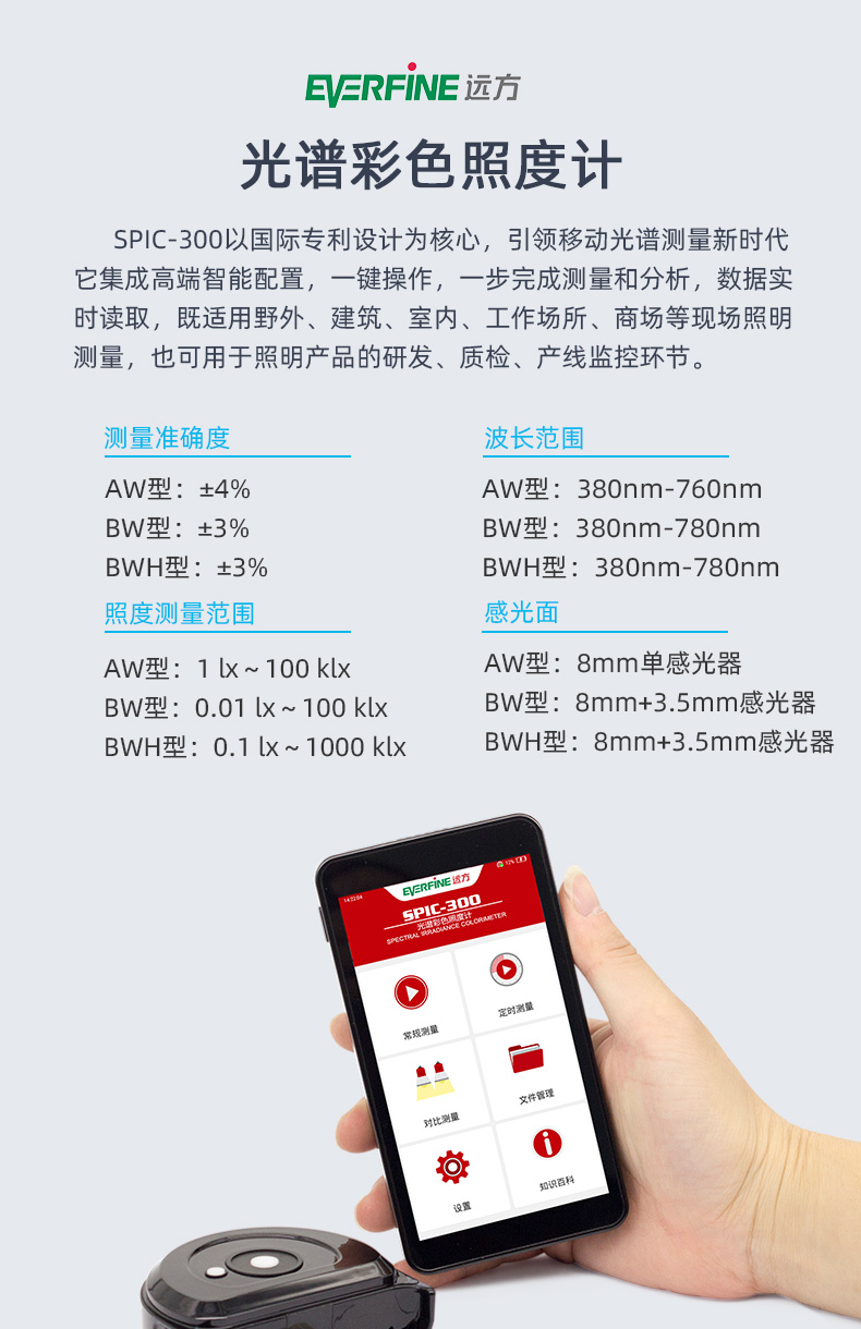 遠(yuǎn)方spic200光譜照度計(jì)spic-300aw以設(shè)計(jì)為核心,移動(dòng)光譜測量新時(shí)代。它集成智能配置,一鍵操作,一步完成測量和分析,數(shù)據(jù)實(shí)時(shí)讀取,既適用野外、建筑、室內(nèi)、工作場所、商場等現(xiàn)場照明測量,也可用于照明產(chǎn)品的研發(fā)、質(zhì)檢、產(chǎn)線監(jiān)控環(huán)節(jié)。