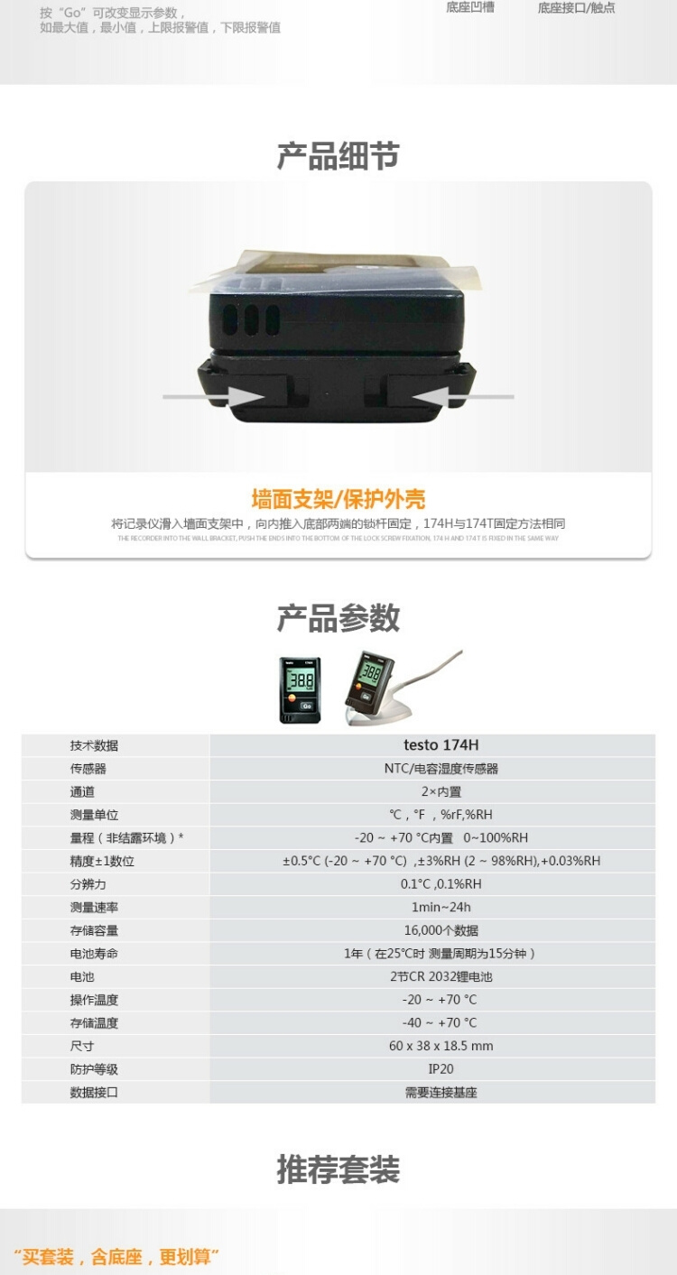 testo 174 H 迷你型數(shù)據(jù)記錄儀,墻面支架,2節(jié)CR 2032鋰電池和出廠報(bào)告。