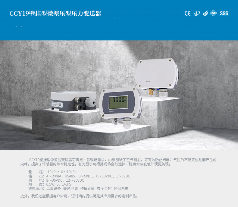微壓差變送器CCY19具有4-20MA、0-10V、RS485多種輸出功能,智能液晶LCD顯示和就地菜單功能。采用進(jìn)口傳感器芯片,具有可靠性高、靈敏度高、精度高,抗過(guò)載能力強(qiáng)等特點(diǎn),廣泛用于航空、石油、化工、冶金、電力、水力、科研、教學(xué)、醫(yī)療、軍工等壓力或差壓(負(fù)壓)測(cè)量。