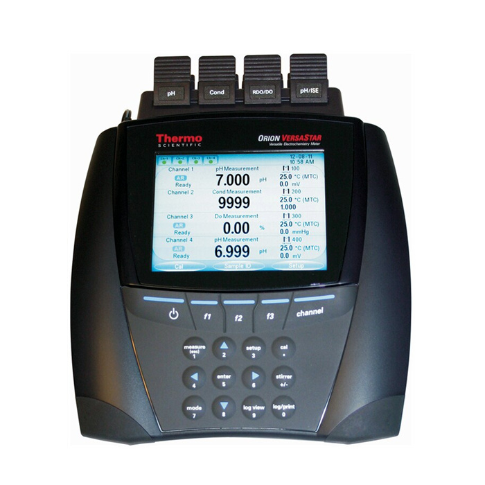 描述Orion Versa Star Pro 臺式測量儀,帶 pH/mV 模塊、電導率/TDS/鹽度/電阻率模塊和支架