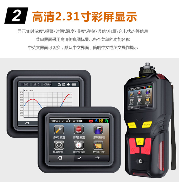 ●2.3英寸高清彩屏顯示實(shí)時(shí)濃度、報(bào)警、時(shí)間、溫度、濕度、存儲(chǔ)、通信、電量、充電狀態(tài)等信息,菜單界面采用高清仿真圖標(biāo)顯示各個(gè)菜單的功能名稱