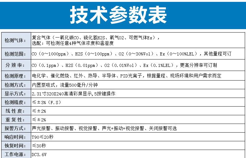 檢測(cè)氣體:復(fù)合氣體(一氧化碳CO、硫化氫H2S、氧氣O2、可燃?xì)怏wEx),