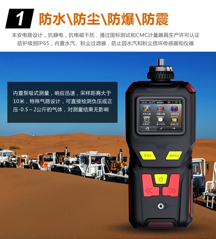 檢測(cè)方式:內(nèi)置泵吸式,流量500毫升/分鐘