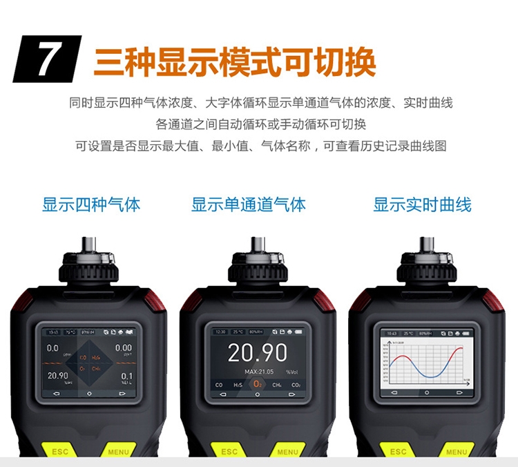●三種顯示模式可切換:同時(shí)顯示四種氣體濃度、大字體循環(huán)顯示單通道氣體的濃度、實(shí)時(shí)曲線,各通道之間自動(dòng)循環(huán)或手動(dòng)循環(huán)可切換,可設(shè)置是否顯示大值、小值、氣體名稱,可查看歷史記錄曲線圖。