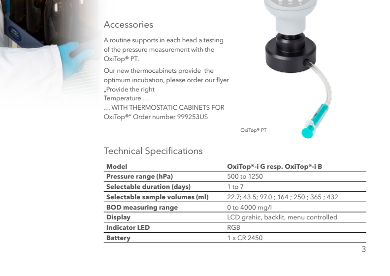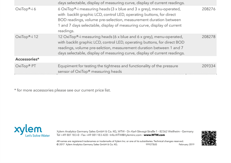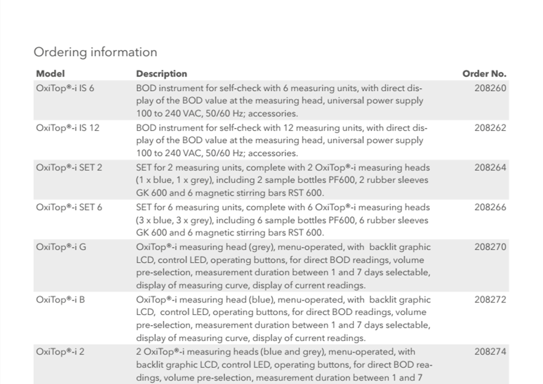 | | 208210 | OxiTop? IS 6, 6個BOD測量單元,含6個OxiTop測量頭(3黃3綠), 6個棕色510ml測量瓶及橡皮筒,6個攪拌棒及1個取棒桿,IS6攪拌器1個,100-240VAC適配器, CO2吸收劑50g*2,硝化抑制劑25ml,164/432ml溢流瓶各1,記錄紙1本,使用手冊 | | 208211 | OxiTop? IS 12, 12個BOD測量單元,含12個OxiTop測量頭(6黃6綠), 12個棕色510ml測量瓶及橡皮筒,12個攪拌棒及1個取棒桿,IS12攪拌器1個,100-240VAC適配器, CO2吸收劑50g*2,硝化抑制劑25ml,164/432ml溢流瓶各1,記錄紙1本,使用手冊 |