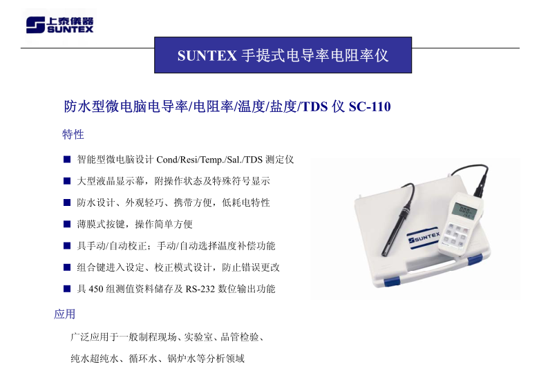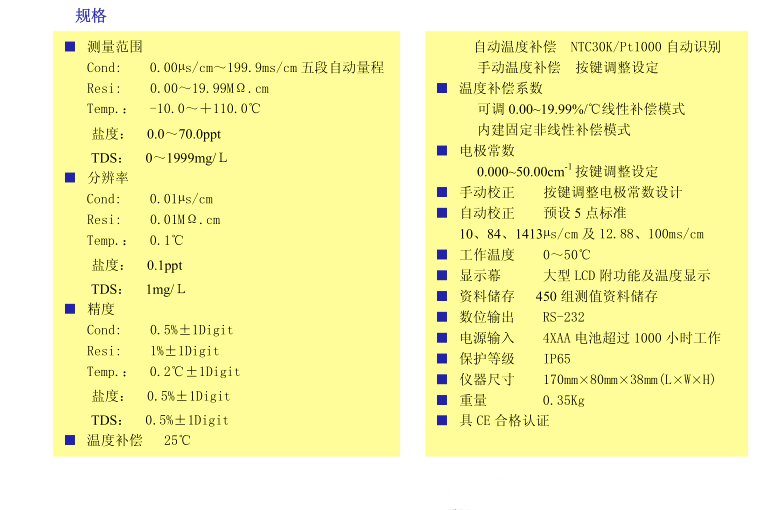 測量范圍:0.00 us/cm~200.0ms/cm 五段范圍,自動ˋ手動切換,0.00~100.0 MΩ-cm,0.0~70.0 ppt,0~2000ppm,-10.0~+110℃