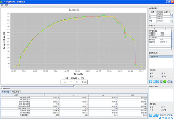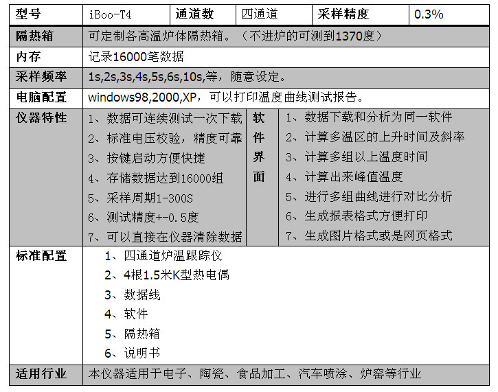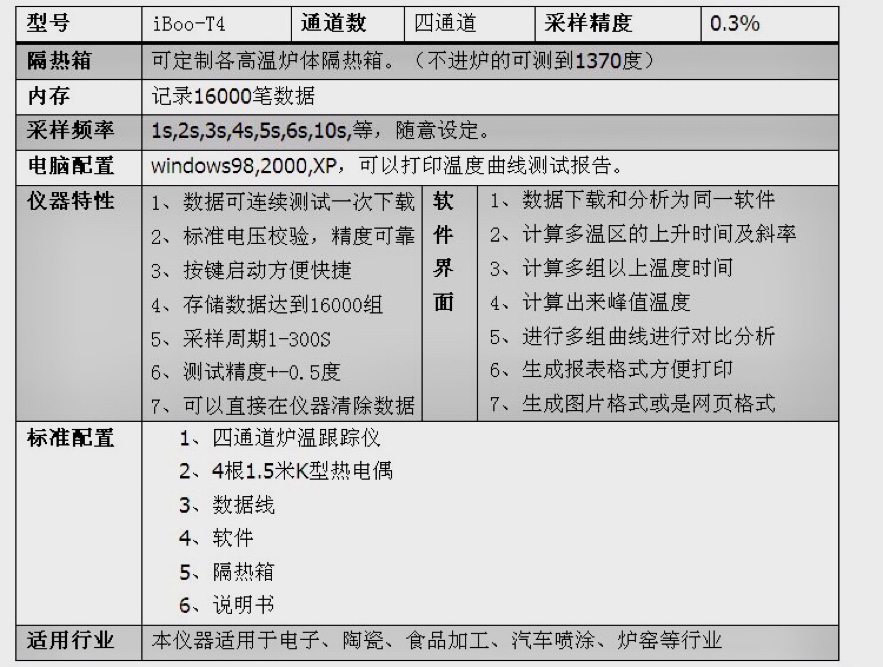 爐溫跟蹤儀ib00-4是一款高精度、高穩定性的爐膛溫度測試記錄產品,填補了國內溫度采集領域的空白,該系統還配有功能強大的軟件分析系統,將采集到的溫度值進行數據保存,上位機軟件分析系統進行功能溫度與長度、時間、產品功能等參數的同步分析處理。