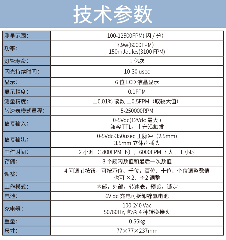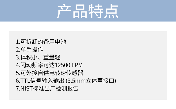 標(biāo)配:頻閃儀、充電器、電池、說明書、檢測報告、包裝箱。
