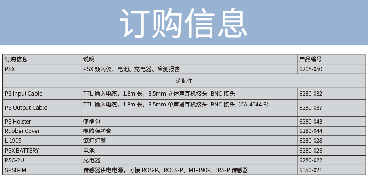選配件:TTL輸入電線,1.8m長,3.5mm立體聲接頭-BNC接頭(公)、TTL輸入電線,1.8m長,3.5mm立體聲接頭-BNC接頭(CA-4044-6)、便攜包裝箱、橡膠保護(hù)套、氙燈燈管、電池、充電器、傳感器供電電源(可接光電傳感器ROS-P、激光傳感器ROLS-P、紅外傳感器IRS-P、磁電傳感器MT-190P、輸入輸出連接線)。