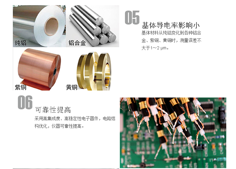 *基體導(dǎo)電率影響小 基體材料從純鋁變化到各種鋁合金、紫銅、黃銅時,測量誤差不大于1~2μm。
