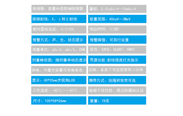 · 響應(yīng)快,根據(jù)環(huán)境劑量自動(dòng)選擇響應(yīng)時(shí)間;