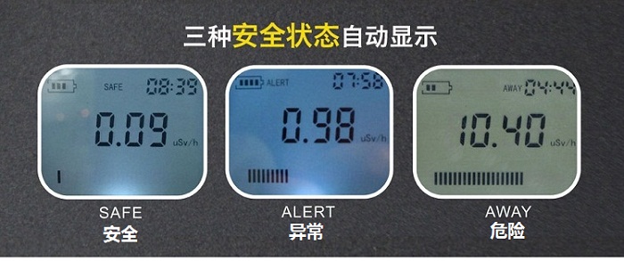 · 狀態(tài):“SAFE"、”ALERT"、“AWAY"自動(dòng)提示,使輻射測(cè)量信息簡(jiǎn)單易懂;