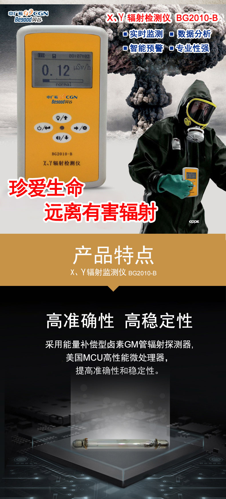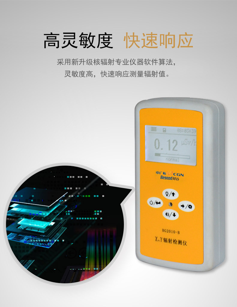 中廣核貝谷個人輻射劑量儀BG2010B采用大尺寸蓋格米勒 (GM)計數管作為探測器,具有較高的輻射檢測靈敏度。儀器采用新型自適應濾波算法,使得產品在測量精度、響應速度兩方面均具有的性能體現。BG2010-B同時測量劑量當量率和累積劑量,用戶可根據不同的應用場合,自行設置劑量當量(率)報警(提醒)闕值,當測量數據超過設定闌值時,儀器自動發出報警(聲、光 或振動)。監測儀采用高性能低功耗處理器,集成度高、尺寸小、功耗低。
