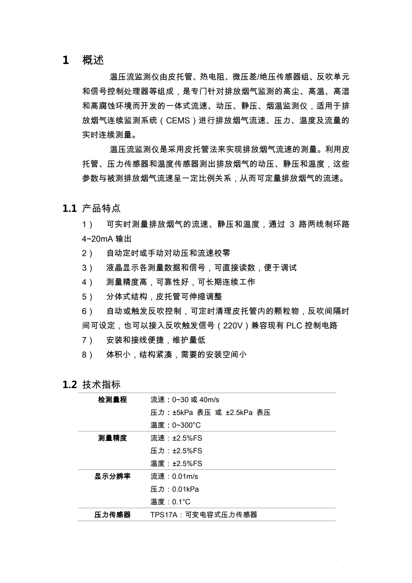 溫壓流一體監測儀(以下簡稱溫壓流監測儀)由S型皮托管、熱電阻、微壓差/絕壓傳感器組、反吹單元和信號控制處理器等組成,是專門針對煙氣排放監測的高塵、高溫、高濕和高腐蝕環境而開發的一體式流速、動壓、靜壓、煙溫監測儀,符合國家相關標準的要求,適用于煙氣排放連續監測系統(CEMS)進行煙氣流速、壓力、溫度及流量的實時連續測量。
