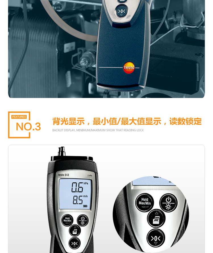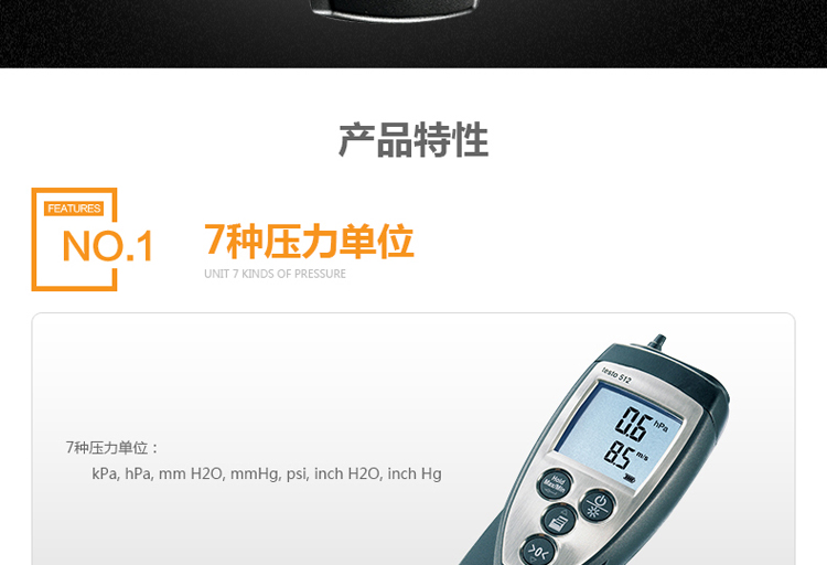 testo512同時顯示壓力與風速測量值。內置2種風速測量單位(m/s和fpm)以及8種壓力測量單位(psi, kPa, hPa, Pa, mm H2O, mmHg, inch H2O及inch Hg)可供自由選擇。
