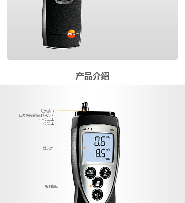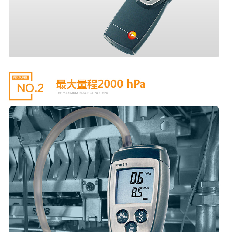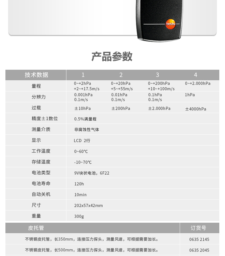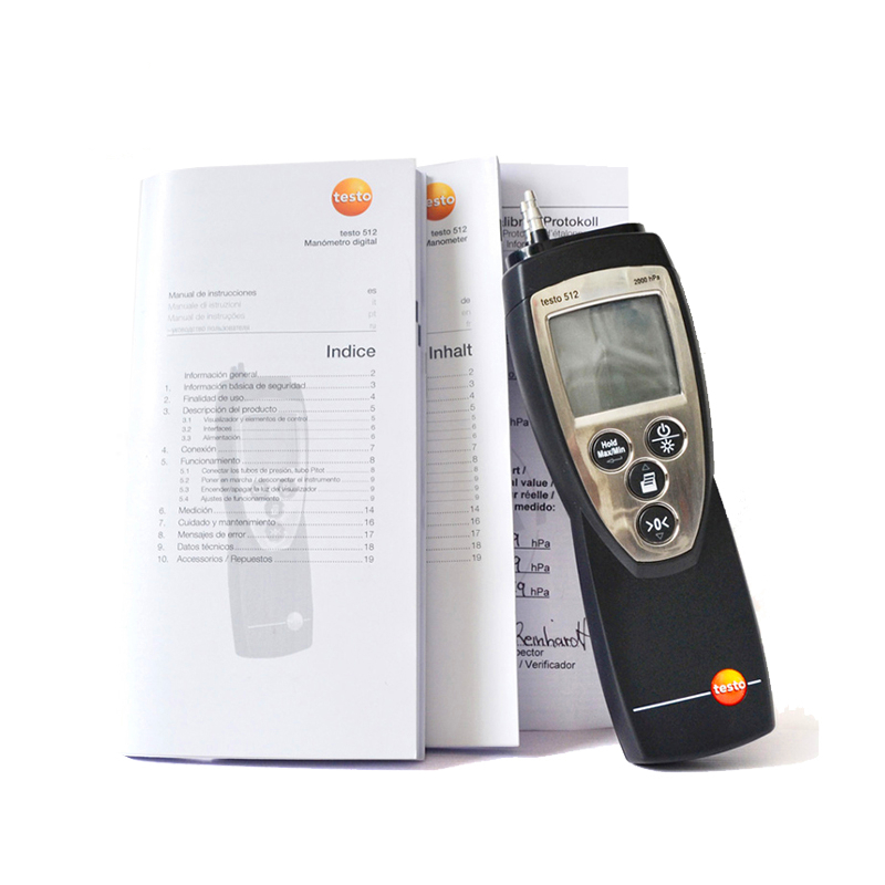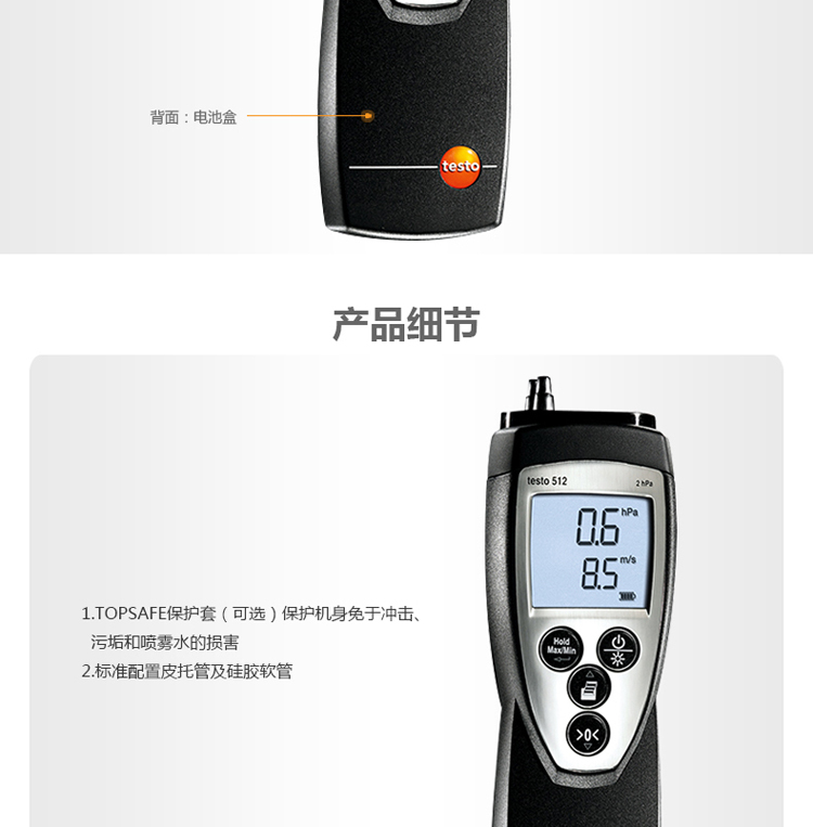 testo 512 便攜式差壓測量儀(量程0 ~ 20 hPa)電池和出廠報告,標準配置皮托管及硅膠軟管。