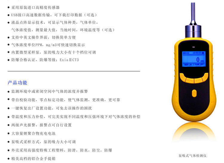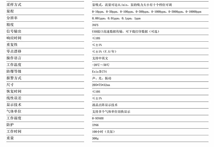 | 工作溫度: | -20℃-50℃,可選配高溫探槍,最高可檢測1200℃的濃度 |