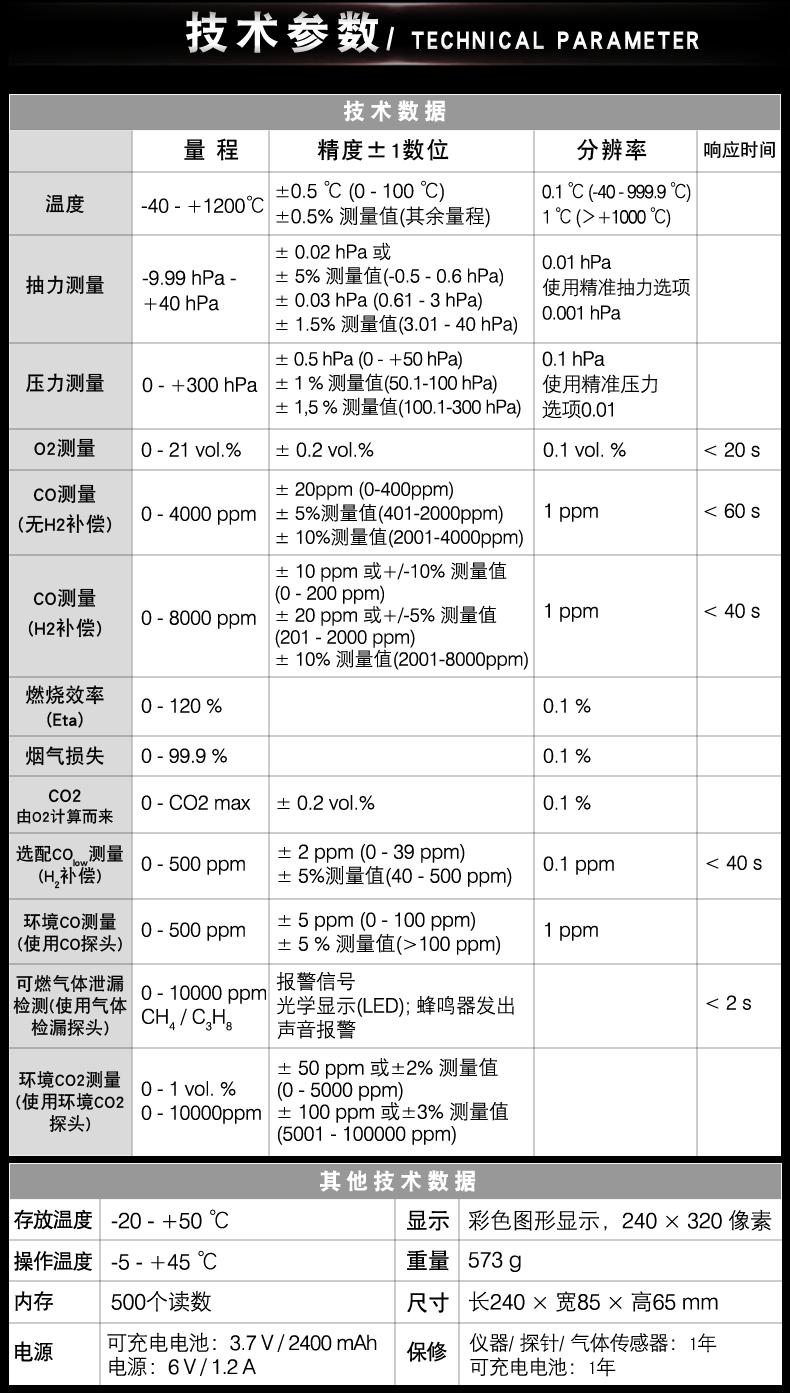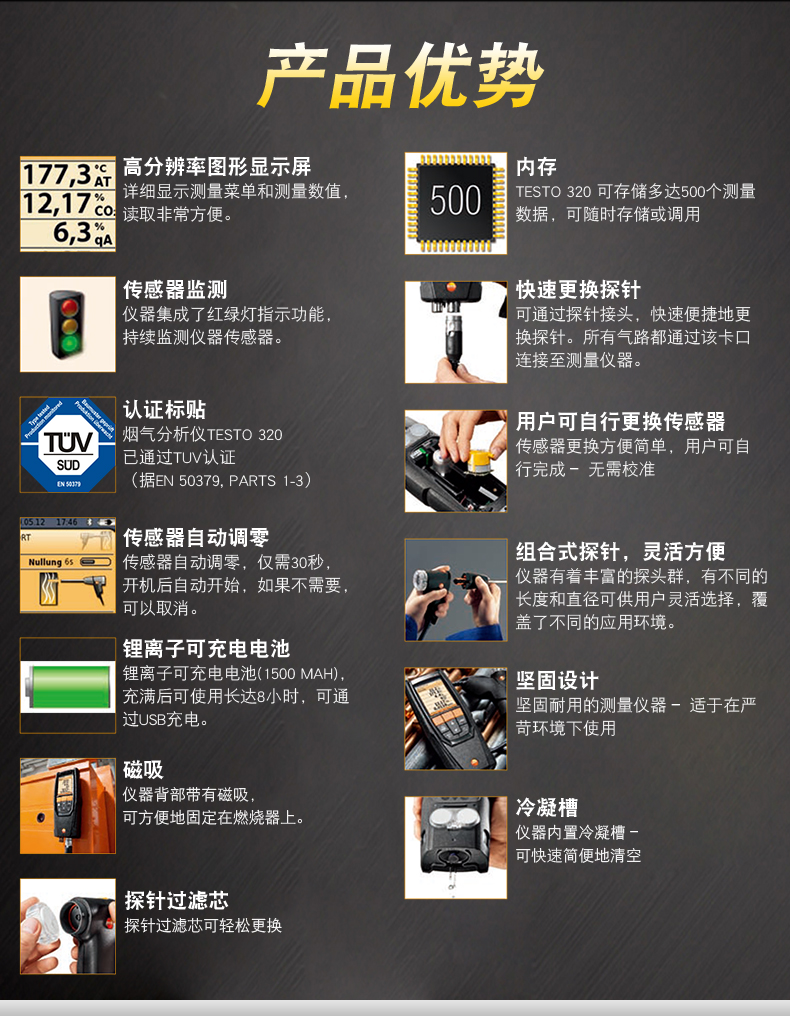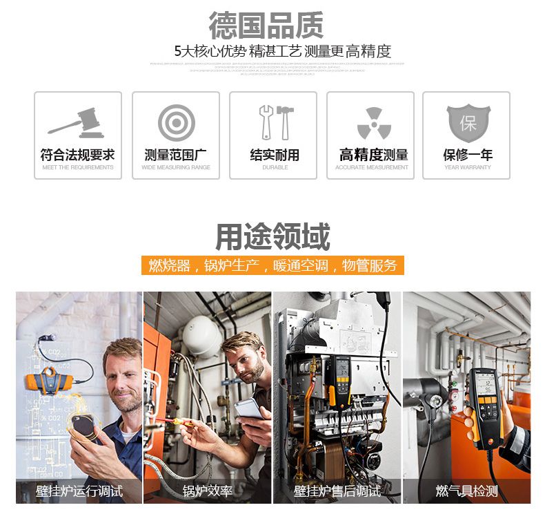 六種應用,一臺儀器:煙氣,煙氣抽力,壓力,燃氣泄漏檢測,環境CO以及溫差測量。訂貨號 0563 3220 75"/>