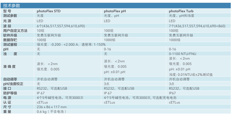 型號(hào) | photoFlex | photoFlex Turb | 光源 | LED | 波長(zhǎng),nm | 436,517,557,594,610,690 | 436,517,557,594,610,690+860 | 自定義方法 | 100組 | 方法/軟件升級(jí) | 互聯(lián)網(wǎng) | 數(shù)據(jù)存儲(chǔ) | 1000組 | pH量程 | 0-16pH | 濁度量程 |
