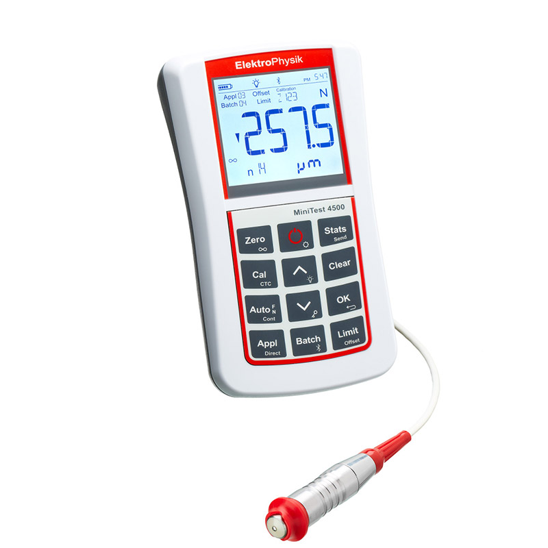 EPK MiniTest 2500/4500涂層測厚儀型號:MiniTest 2500/4500 簡介 EPK MiniTest 2500/4500涂層測厚儀不僅適用于實驗室,而且還由于其堅固耐用的IP65 防護等級,所以同樣適用于工業應用。兩款機型均配備 USB輸出,可連接筆記本電腦和臺式電腦。 另外MiniTest 4500還提供藍牙輸出,用于無線數據直接傳輸到移動設備,如智能手機和打印機。所有主機功能都可以直接按下發光鍵盤上的一個按鍵來觸發。符合人體工程學設計的帶有背光照明的大型顯示屏可提高用戶的舒適度和。MiniTest 2500/4500系列涂層測厚儀提供多種測量探頭,使其可以處理標準應用以及更復雜的測量任務。 應用范圍由連接到主機的探頭決定: ? F-型探頭根據磁感應原理工作,可以測量涂覆在鋼鐵(包括鋼合金和淬硬磁鋼)上的涂料、搪瓷、橡膠、鋁、鉻、銅、鋅等非磁性涂層。 ? N-型探頭根據渦流原理工作,并測量應用于所有有色金屬(如鋁、銅、鋅壓鑄件、黃銅等,包括奧氏體 - 尼龍鋼)上的絕緣涂料,如涂料、陽極氧化、陶瓷等。 ? FN-型探頭結合了兩種原理,并識別涂層下面的基材,從而自動切換到正確的測量原理,以測量鋼材或有色金屬基材。 MiniTest 2500/4500涂層測厚儀特點 ? 所有功能均可直接訪問 ? 大量的可互換探頭 ? 高對比度顯示屏和背光鍵盤 ? 存儲和統計 ? 藍牙和USB輸出 ? IP 65防護等級的堅固外殼